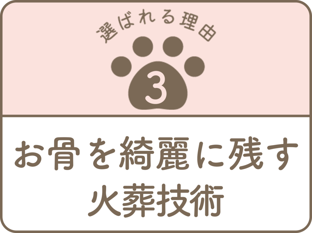 大切な家族であるペットとの最期のお別れは、とても悲しく、辛いものです。そんな時、ご家族様のお気持ちに寄り添い、心のこもったご葬儀ができるよう、誠心誠意努めさせて頂きます。当店では、時間をかけて丁寧に火葬を行うため、「お骨の形が綺麗に残る」と喜びのお声をたくさん頂いております。