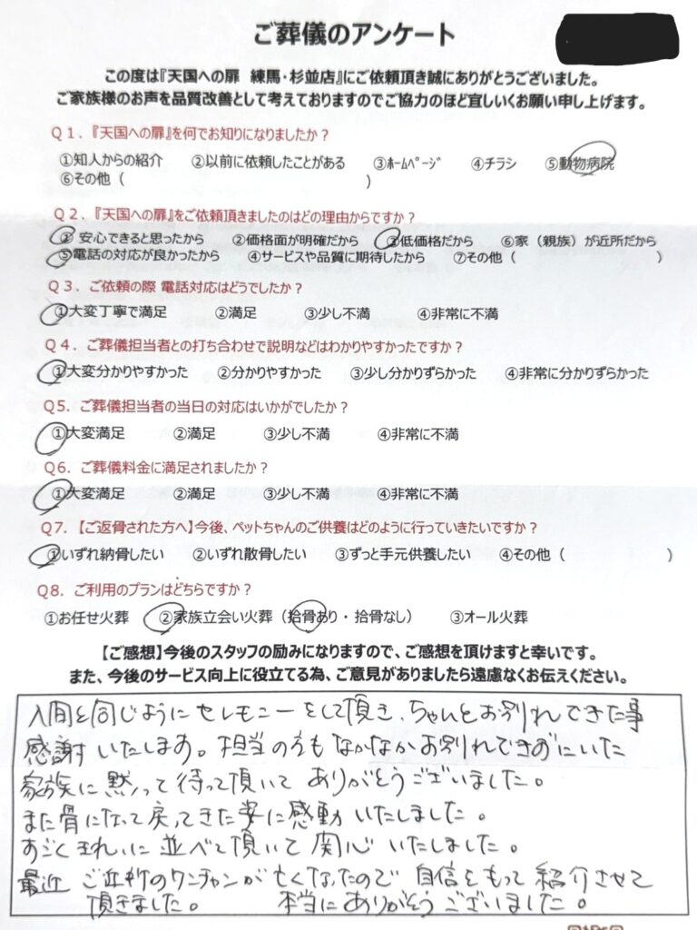 【人間とい同じようにセレモニーをして頂き、ちゃんとお別れできた事感謝いたします。担当の方もなかなかお別れできずにいた家族に黙って待って頂いてありがとうございました。また骨になって戻ってきた姿に感動いたしました。すごくきれいに並べて頂いて関心いたしました。最近ご近所のワンちゃんが亡くなったので、自信をもって紹介させていただきました。本当にありがとうございました。】