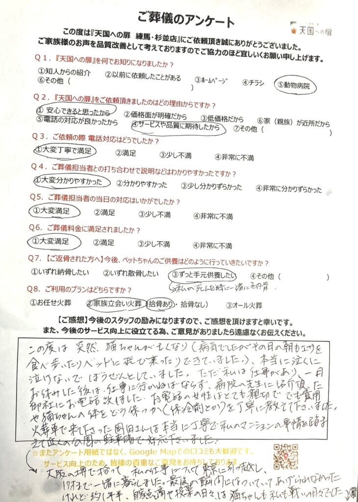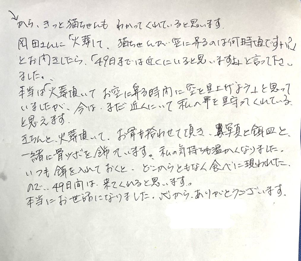 大変励みになるご感想をありがとうございました。お電話でお話させていただいた者です。お電話から、とても辛く、何をどうしていいかわからないという気持ちが伝わってきました。私も猫を見送っており、仕事から帰ったら亡くなっていた…という事を経験しておりますので、痛いほど気持ちがわかります。大阪から引っ越しで一緒に来られて、思い出もたくさんある事と思います。出会った場所、名前を付けた時の事など、素敵な思い出を思い返すことも心の整理に繋がります。あせらずに、ゆっくりと前に進んでいってほしいと思っております。これからもご家族様が後悔なく、お見送りができるご葬儀、サービスがご提供できますよう、これからも日々精進していきたいと思います。