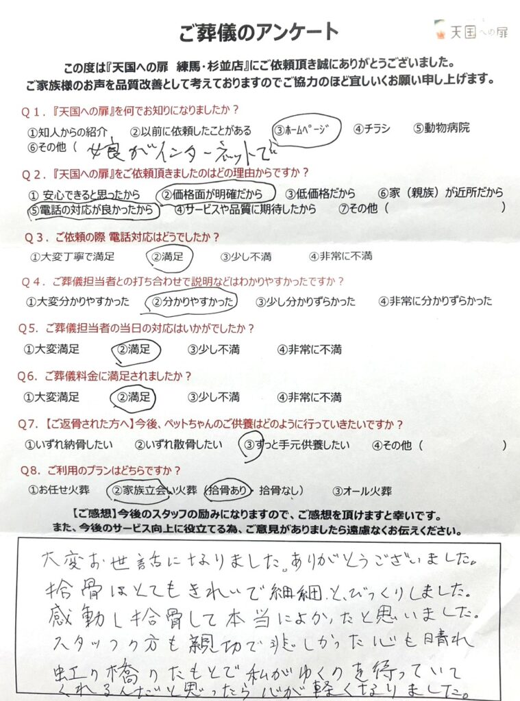 【大変お世話になりました。ありがとうございました。拾骨はとてもきれいで繊細と、とにかくびっくりしました。感動し拾骨して本当によかったと思いました。スタッフの方も親切で悲しかった心も晴れ、虹の橋のたもとで私がゆくのを待っていてくれるんだと思ったら心が軽くなりました。】