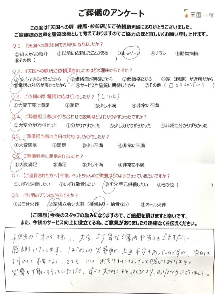 大変励みになるご感想をありがとうございました。はじめての火葬車でのご葬儀は、きっと不安だったと思います。初めての訪問火葬サービスでもご不安な気持ちのないよう、今後もご相談からご葬儀まで誠心誠意努めさせていただきます。これからもご家族様が後悔なく、お見送りができるご葬儀、サービスがご提供できますよう、これからも日々精進していきたいと思います。