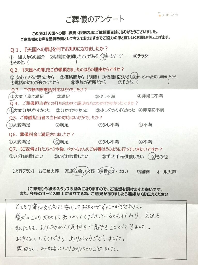 大変励みになるご感想をありがとうございました。ペットちゃんは家族です。大切に扱わせていただくのは当然のことですが、穏やかなお気持ちになられたとのこと、大変光栄でございます。これからもご家族様が後悔なく、お見送りができるご葬儀、サービスがご提供できますよう、これからも日々精進していきたいと思います。